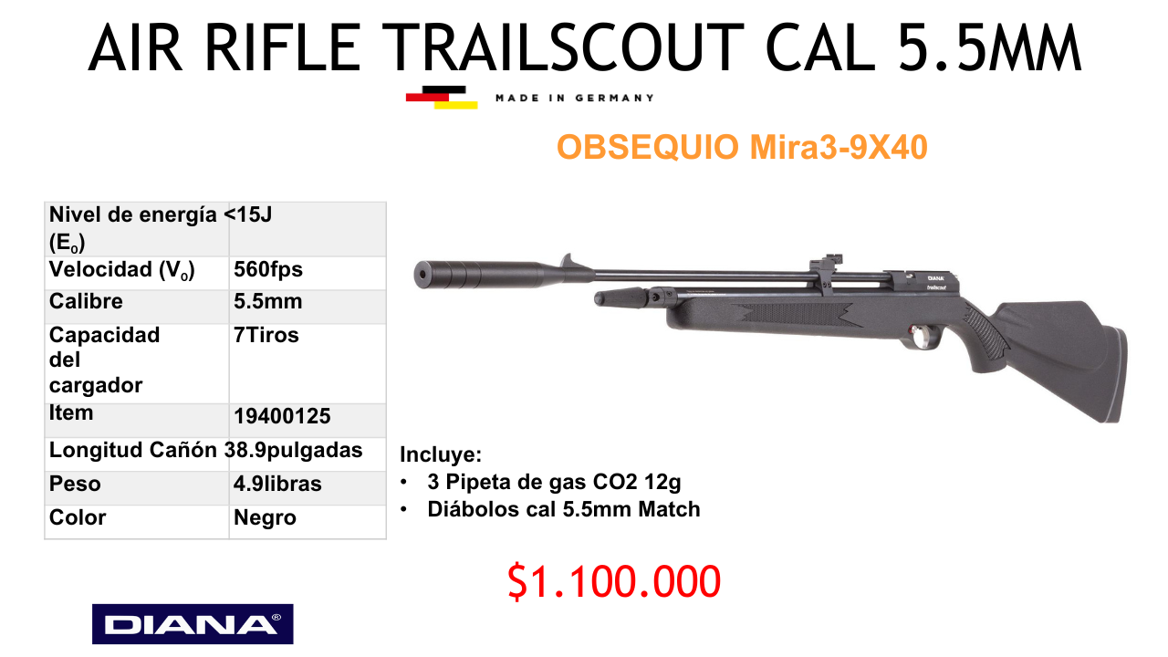 El Trailscout es un rifle semiautomático con culata moderna (sintética u opcional madera), propulsado por tres cápsulas de CO₂ de 12 g (sistema patentado de Diana) que ofrece hasta ~100 disparos por carga, ideal para plinking, tiro deportivo o caza menor