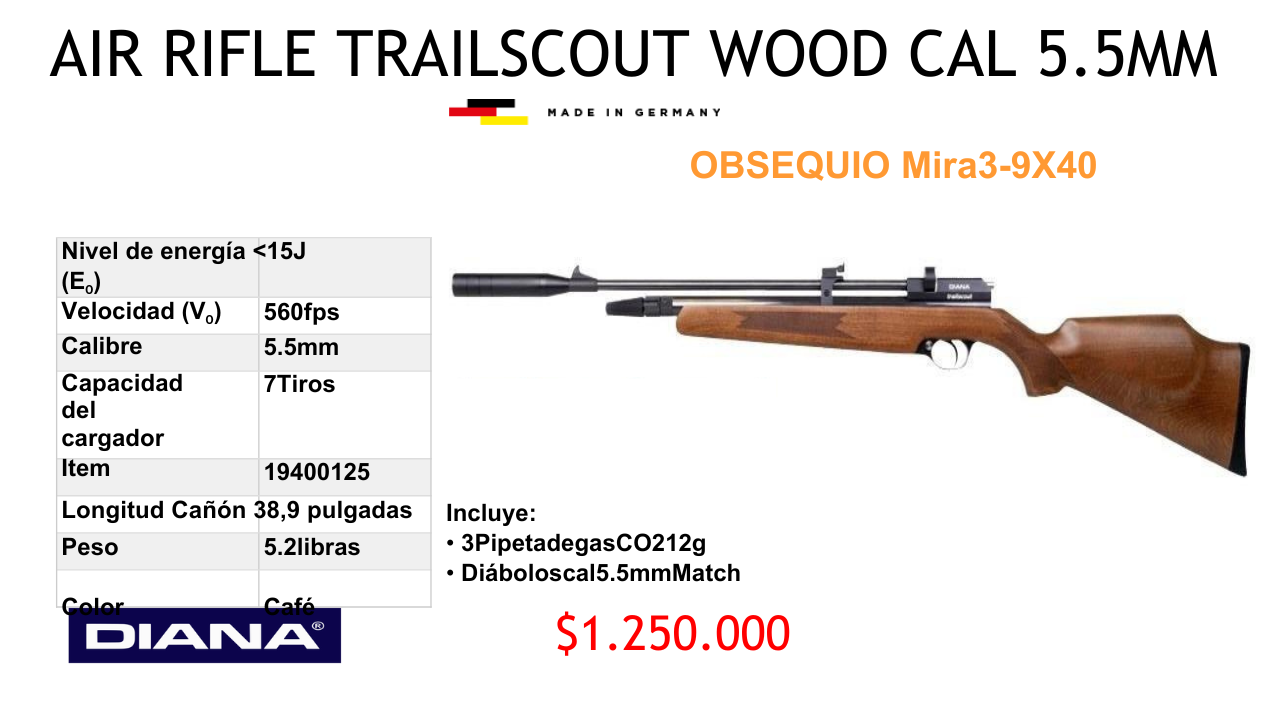 La carabina de aire comprimido Diana Trailscout Wood en calibre 5.5 mm es una opción destacada para tiradores recreativos que buscan precisión, diseño clásico y facilidad de uso. Su construcción robusta y características avanzadas la hacen ideal tanto para principiantes como para tiradores experimentados.