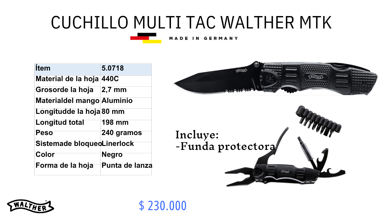 Combina la funcionalidad de un cuchillo táctico con un conjunto de herramientas útiles para emergencias, reparaciones u outdoor.