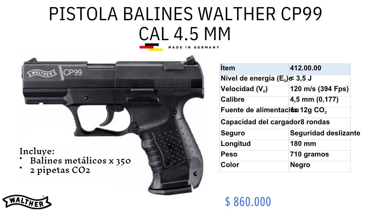 La Walther CP99 es una réplica moderna de la famosa pistola P99, pensada para tiro recreativo, entrenamiento y coleccionismo. Usa cápsulas de CO₂ de 12 g y dispara balines, con un cargador rotatorio de 8 tiros