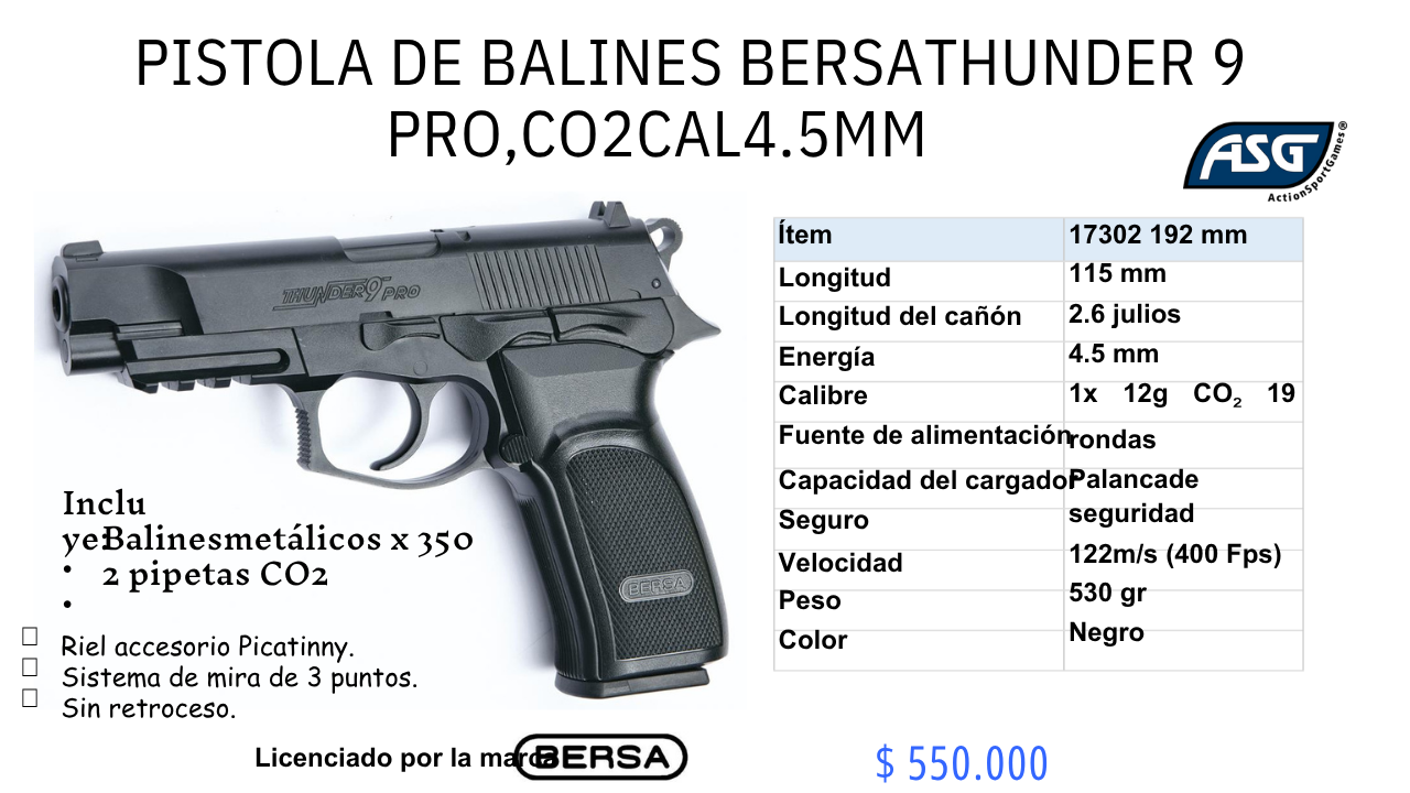 Pistola De Balin BERSATHUNDER 9 pro co2 C/4.5 mm