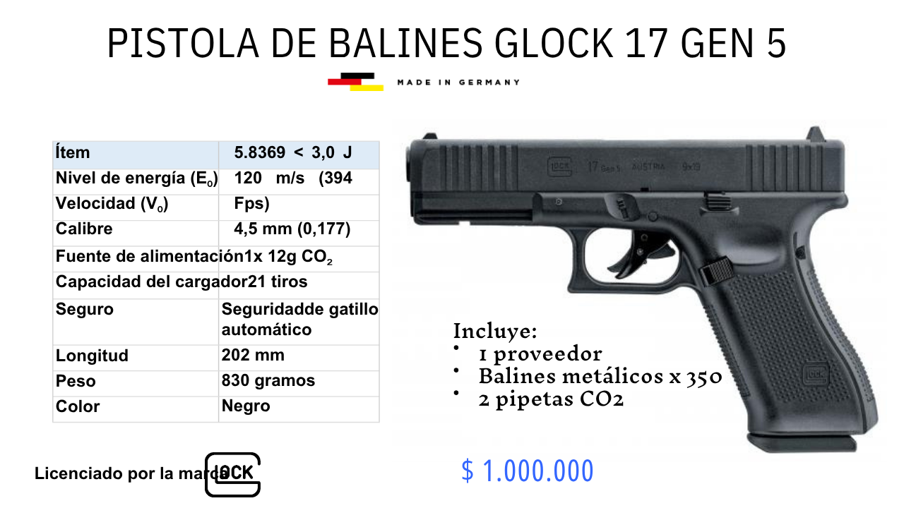 La Glock 17 Gen 5 CO₂ de Umarex es una réplica oficial y licenciada del clásico modelo de fuego real. Utiliza un cartucho de CO₂ de 12 g y dispara balines calibre .177 a través de un cañón estriado tipo rifled barrel, lo que mejora la precisión y la experiencia de tiro.
