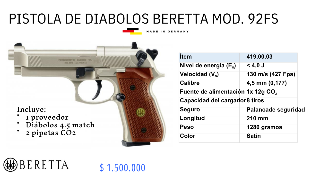 Esta réplica fiel del icónico modelo Beretta 92FS, emplea cápsulas de CO₂ de 12 g y disparo semiautomático. Incluye cargadores rotatorios de 8 balines, corredera metálica, miras ajustables y mecanismo DA/SA que incluso ofrece retroceso, aunque no es blowback completo