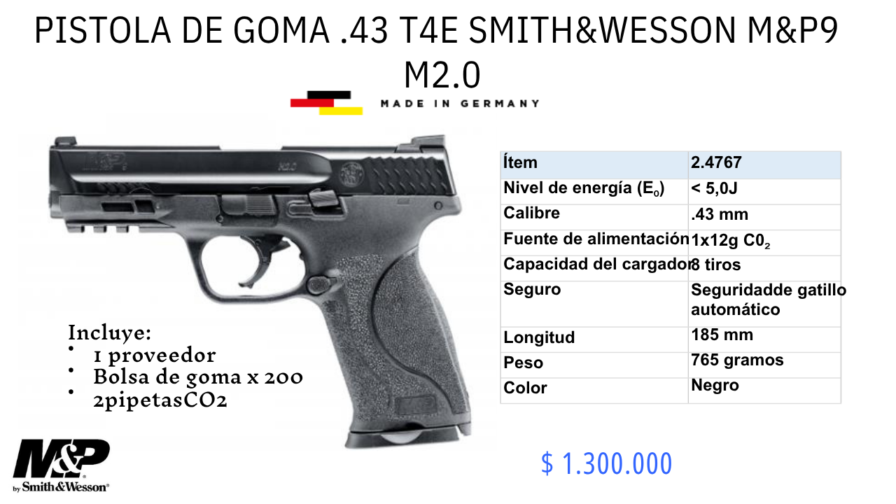La Pistola de Goma .43 Smith & Wesson M&P9 M2.0 es una réplica de entrenamiento semiautomática de alta calidad, diseñada para ofrecer una experiencia realista en prácticas de defensa personal, entrenamiento táctico y actividades recreativas. Fabricada por Umarex bajo la línea T4E (Training for Engagement), esta pistola es ampliamente utilizada por fuerzas de seguridad y entusiastas del paintball.