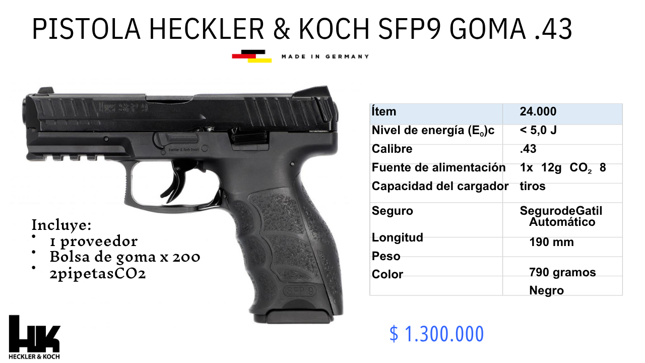 La Pistola Heckler & Koch SFP9 Cal. .43 es una réplica de entrenamiento de alta calidad, diseñada para ofrecer una experiencia realista en prácticas de defensa personal, entrenamiento táctico y actividades recreativas. Fabricada por Umarex bajo la línea T4E (Training for Engagement), esta pistola es ampliamente utilizada por fuerzas de seguridad y entusiastas del paintball.
