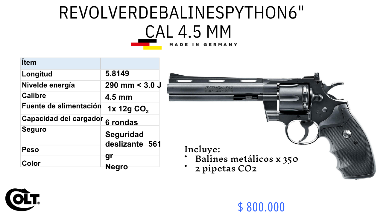 Este revólver CO₂ de calibre .177 (4.5 mm) es fabricado bajo licencia por Umarex, replicando fielmente el diseño del legendario Colt Python. Dispara balines metálicos (BBs) o pellets, y destaca por su construcción realista y uso recreativo o coleccionable.