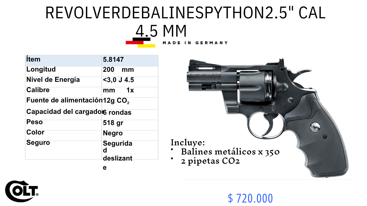 El Colt Python 2.5″ es una réplica de aire comprimido fabricada por Umarex bajo licencia de Colt. Dispara balines BB o pellets (.177 / 4.5 mm) empleando un cartucho de CO₂ de 12 g. Perfecto para tiro recreativo y coleccionismo