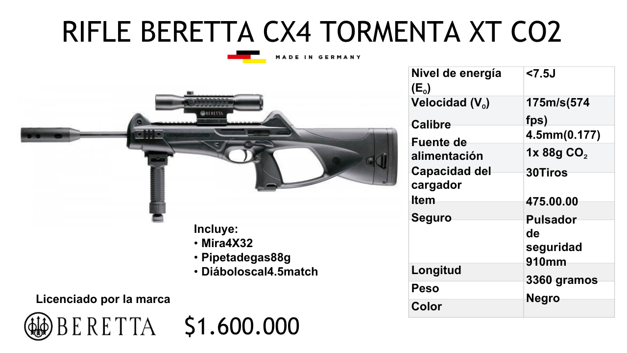La Beretta CX4 Storm XT es una carabina semiautomática de CO₂ diseñada por Umarex con licencia original de Beretta. Cuenta con un tanque de CO₂ de 88 g alojado en la culata, riel Picatinny, bipod, moderador y visor incluido en el kit XT.