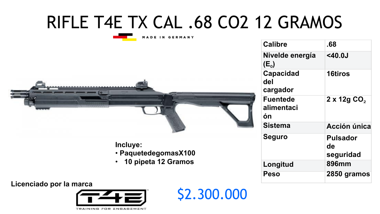 El T4E TX 68 es un marcadora tipo rifle semiautomática de bombeo alimentada por CO₂, diseñada tanto para entrenamiento táctico como para uso recreativo o deportivo. Disponible en versiones de <7.5 J, <16 J y <40 J (con cartucho de 88 g) Alcanza velocidades de hasta ~430 fps (~130 m/s